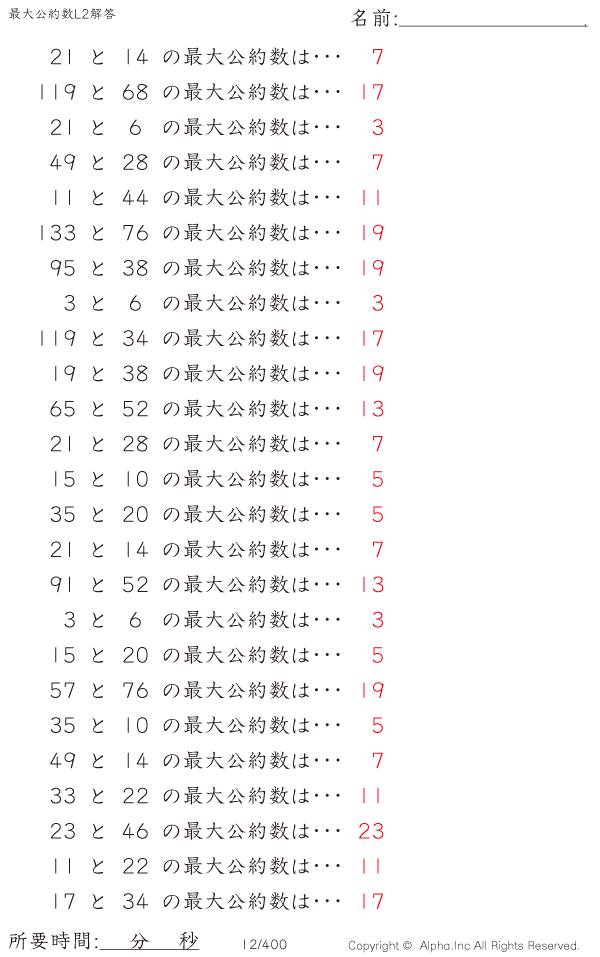 上記のボタンから「最大公約数レベル2」の算数数学ドリル・計算ドリル(PDFプリント)がダウンロードできます。個人利用は無料です(家庭以外での配布は有料です)。