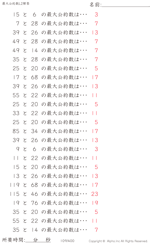 上記のボタンから「最大公約数レベル2」の算数数学ドリル・計算ドリル(PDFプリント)がダウンロードできます。個人利用は無料です(家庭以外での配布は有料です)。