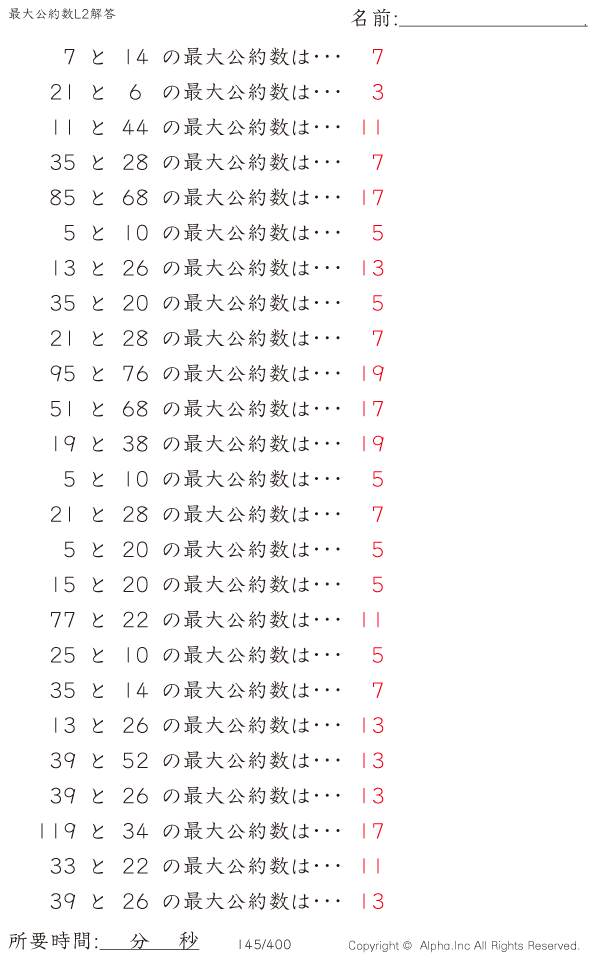 上記のボタンから「最大公約数レベル2」の算数数学ドリル・計算ドリル(PDFプリント)がダウンロードできます。個人利用は無料です(家庭以外での配布は有料です)。