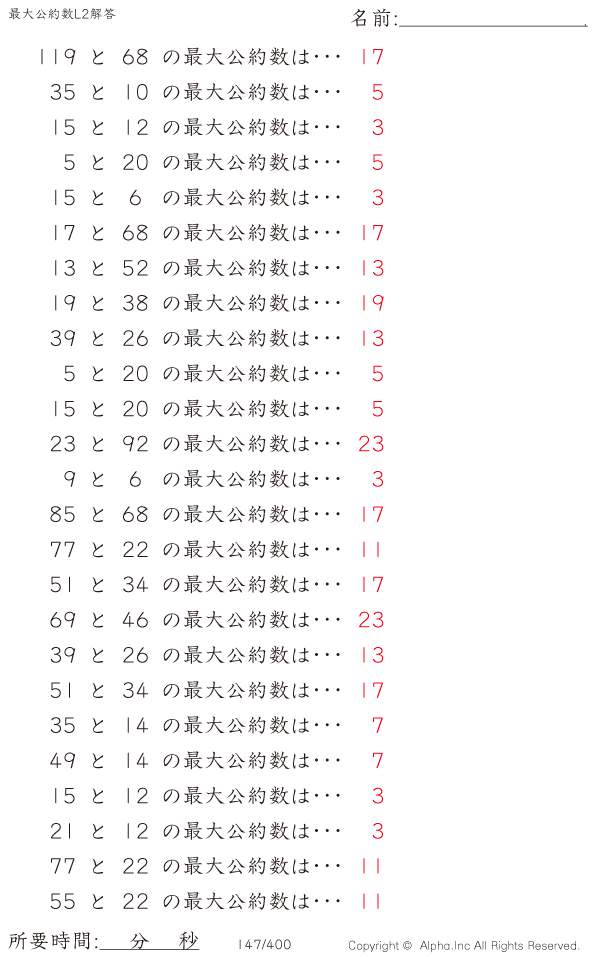 上記のボタンから「最大公約数レベル2」の算数数学ドリル・計算ドリル(PDFプリント)がダウンロードできます。個人利用は無料です(家庭以外での配布は有料です)。