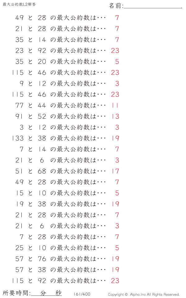 上記のボタンから「最大公約数レベル2」の算数数学ドリル・計算ドリル(PDFプリント)がダウンロードできます。個人利用は無料です(家庭以外での配布は有料です)。