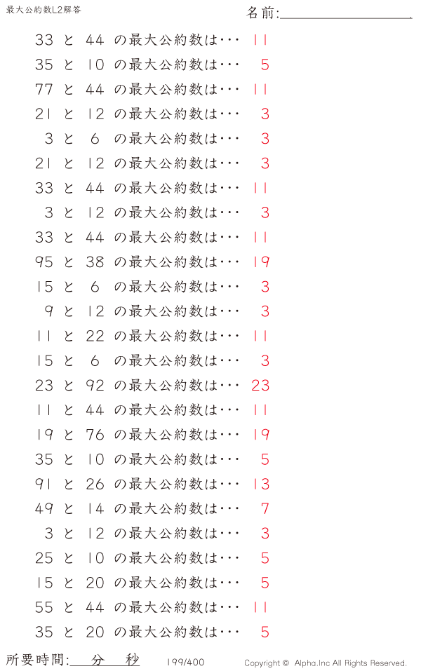 上記のボタンから「最大公約数レベル2」の算数数学ドリル・計算ドリル(PDFプリント)がダウンロードできます。個人利用は無料です(家庭以外での配布は有料です)。
