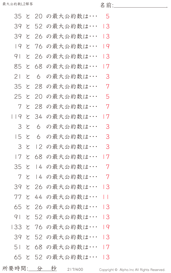 上記のボタンから「最大公約数レベル2」の算数数学ドリル・計算ドリル(PDFプリント)がダウンロードできます。個人利用は無料です(家庭以外での配布は有料です)。