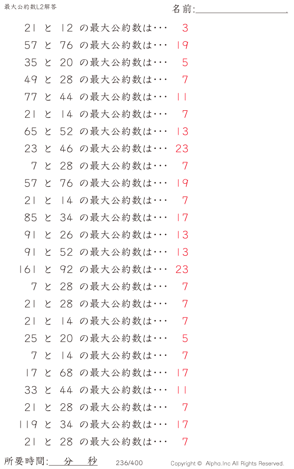 上記のボタンから「最大公約数レベル2」の算数数学ドリル・計算ドリル(PDFプリント)がダウンロードできます。個人利用は無料です(家庭以外での配布は有料です)。