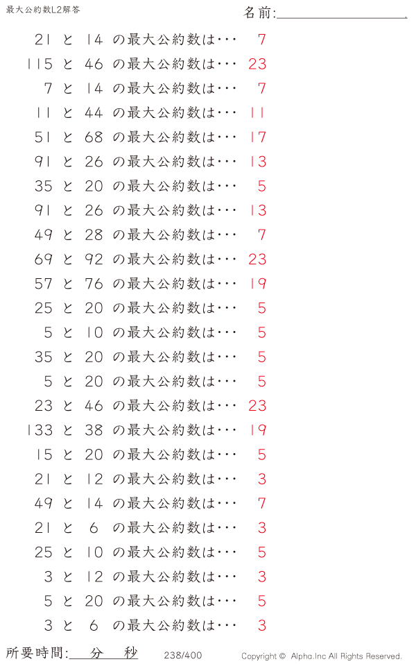 上記のボタンから「最大公約数レベル2」の算数数学ドリル・計算ドリル(PDFプリント)がダウンロードできます。個人利用は無料です(家庭以外での配布は有料です)。