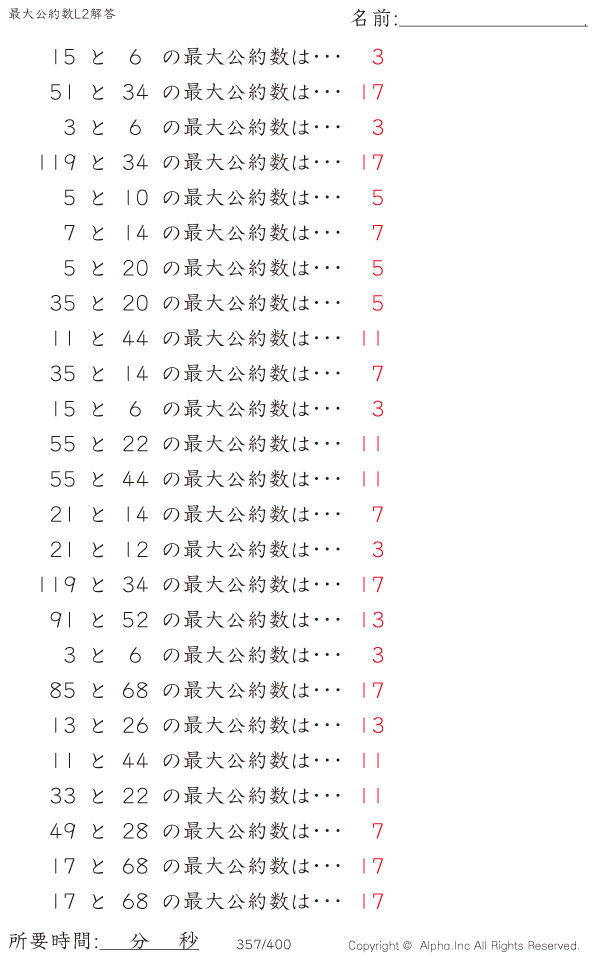 上記のボタンから「最大公約数レベル2」の算数数学ドリル・計算ドリル(PDFプリント)がダウンロードできます。個人利用は無料です(家庭以外での配布は有料です)。
