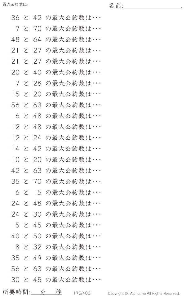 上記のボタンから「最大公約数レベル3」の算数数学ドリル・計算ドリル(PDFプリント)がダウンロードできます。個人利用は無料です(家庭以外での配布は有料です)。