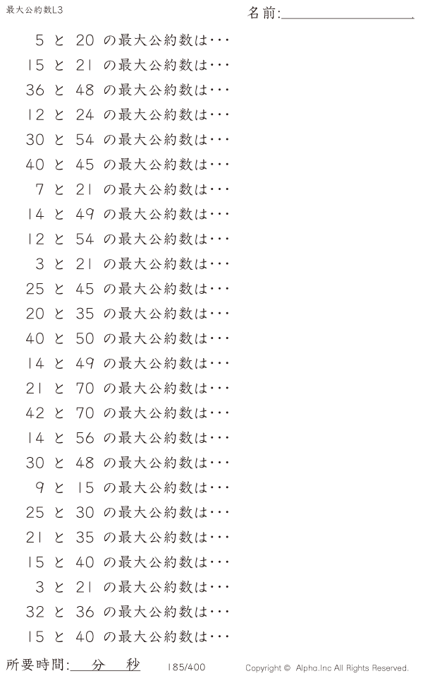 上記のボタンから「最大公約数レベル3」の算数数学ドリル・計算ドリル(PDFプリント)がダウンロードできます。個人利用は無料です(家庭以外での配布は有料です)。