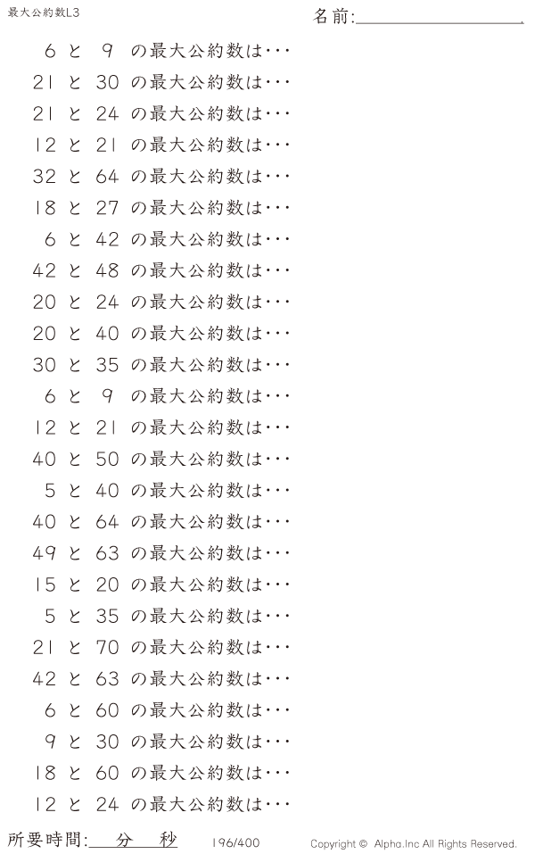 上記のボタンから「最大公約数レベル3」の算数数学ドリル・計算ドリル(PDFプリント)がダウンロードできます。個人利用は無料です(家庭以外での配布は有料です)。