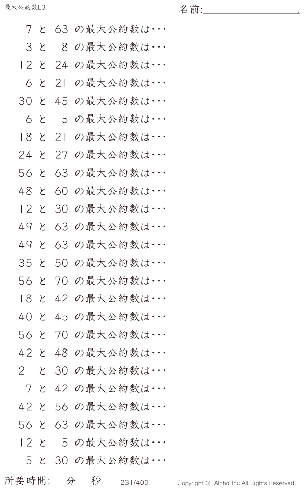 上記のボタンから「最大公約数レベル3」の算数数学ドリル・計算ドリル(PDFプリント)がダウンロードできます。個人利用は無料です(家庭以外での配布は有料です)。
