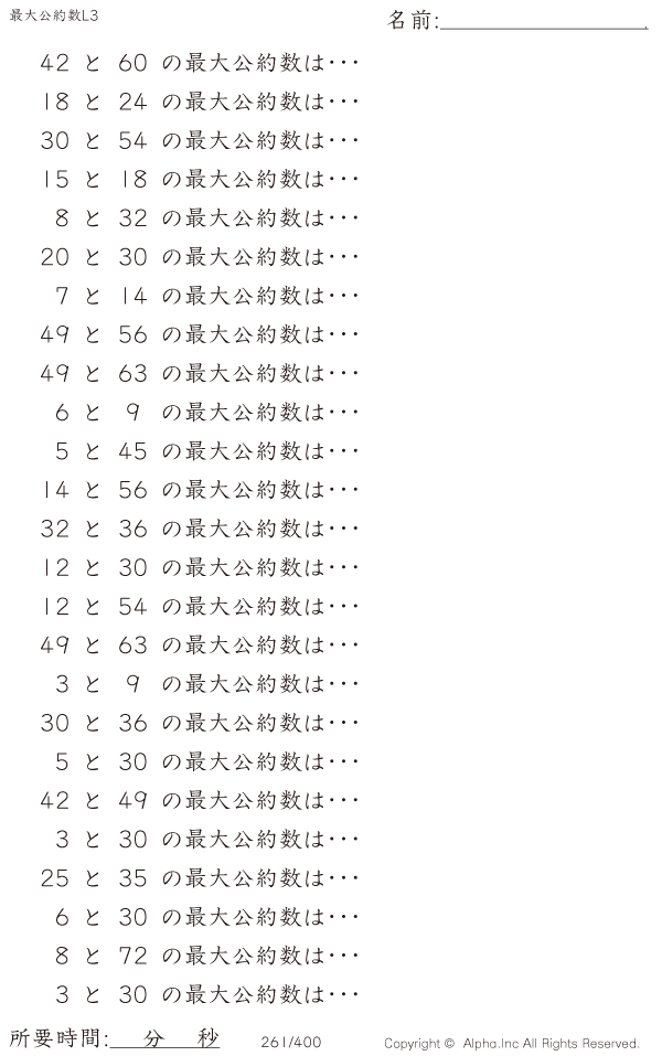 上記のボタンから「最大公約数レベル3」の算数数学ドリル・計算ドリル(PDFプリント)がダウンロードできます。個人利用は無料です(家庭以外での配布は有料です)。