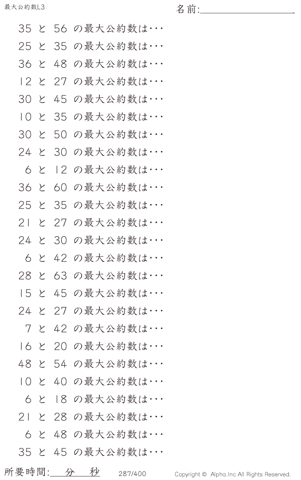 上記のボタンから「最大公約数レベル3」の算数数学ドリル・計算ドリル(PDFプリント)がダウンロードできます。個人利用は無料です(家庭以外での配布は有料です)。