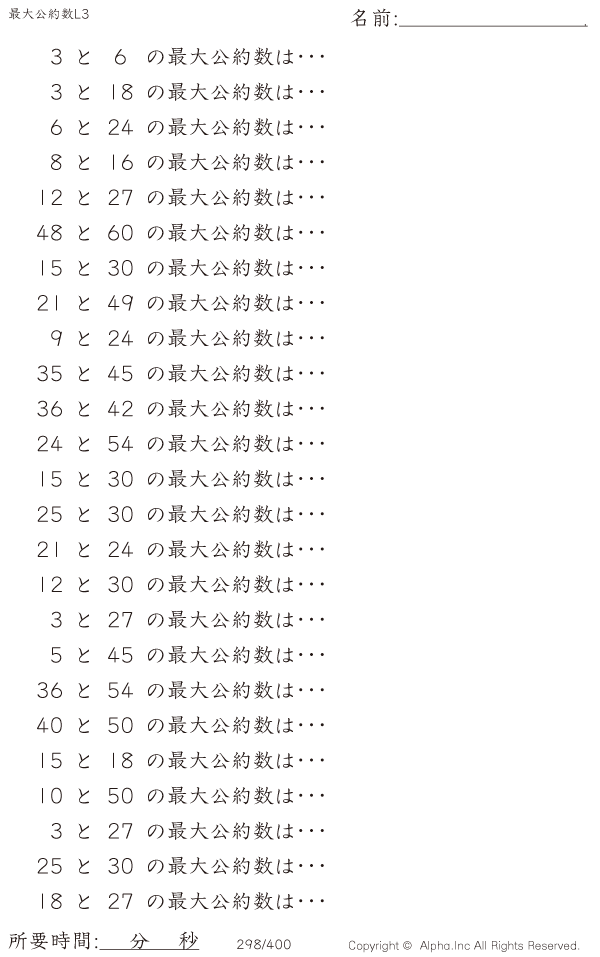 上記のボタンから「最大公約数レベル3」の算数数学ドリル・計算ドリル(PDFプリント)がダウンロードできます。個人利用は無料です(家庭以外での配布は有料です)。