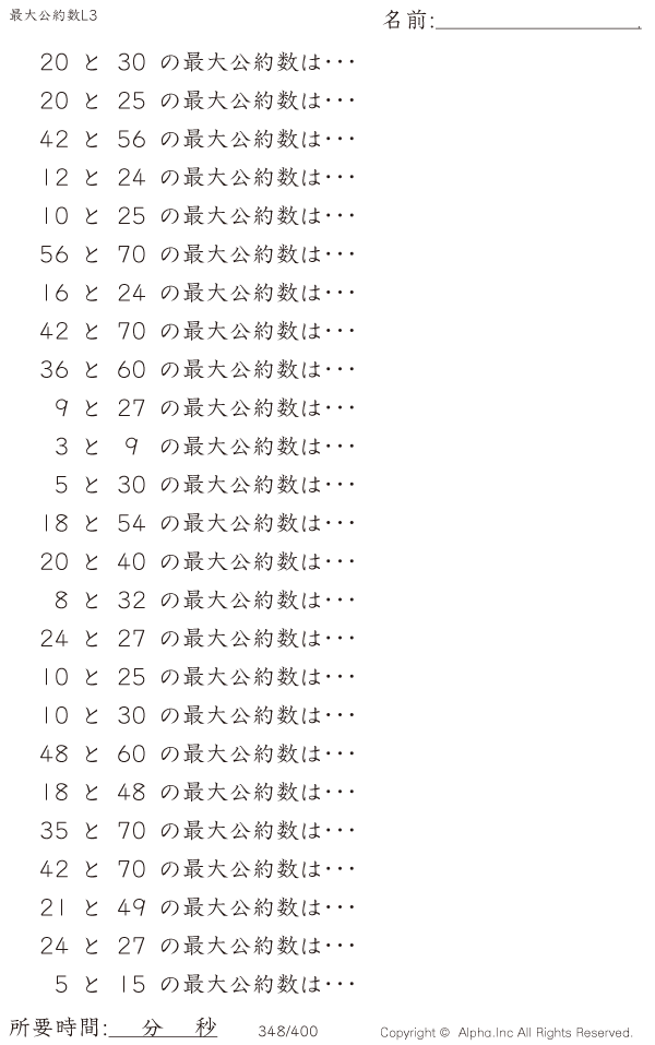 上記のボタンから「最大公約数レベル3」の算数数学ドリル・計算ドリル(PDFプリント)がダウンロードできます。個人利用は無料です(家庭以外での配布は有料です)。