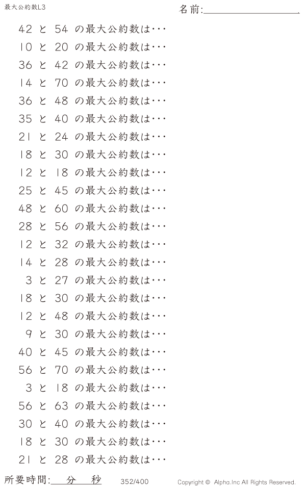 上記のボタンから「最大公約数レベル3」の算数数学ドリル・計算ドリル(PDFプリント)がダウンロードできます。個人利用は無料です(家庭以外での配布は有料です)。