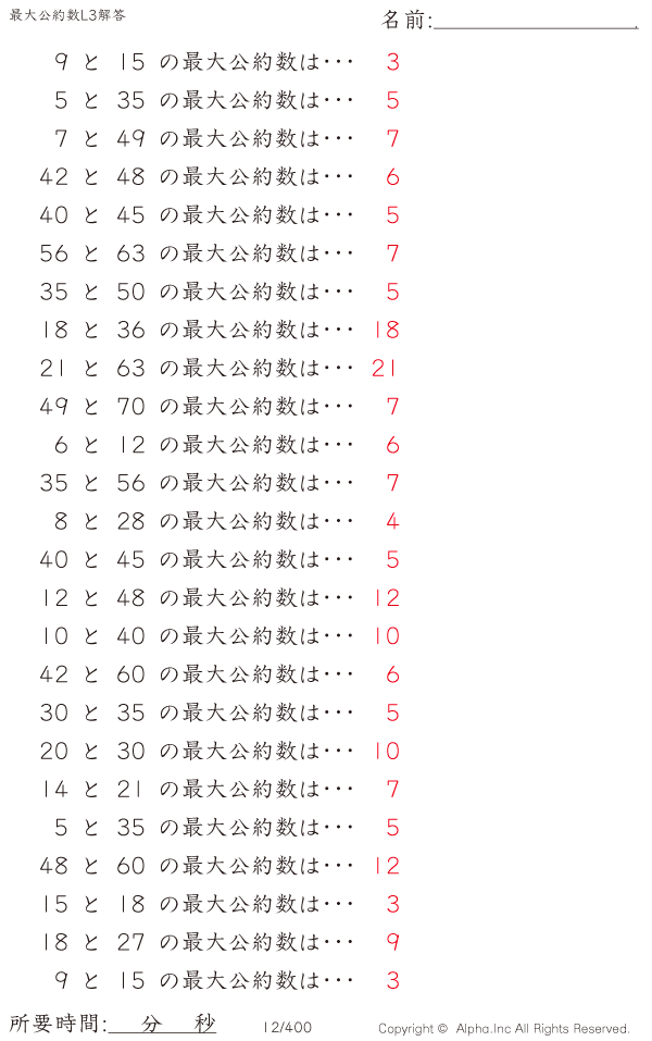 上記のボタンから「最大公約数レベル3」の算数数学ドリル・計算ドリル(PDFプリント)がダウンロードできます。個人利用は無料です(家庭以外での配布は有料です)。