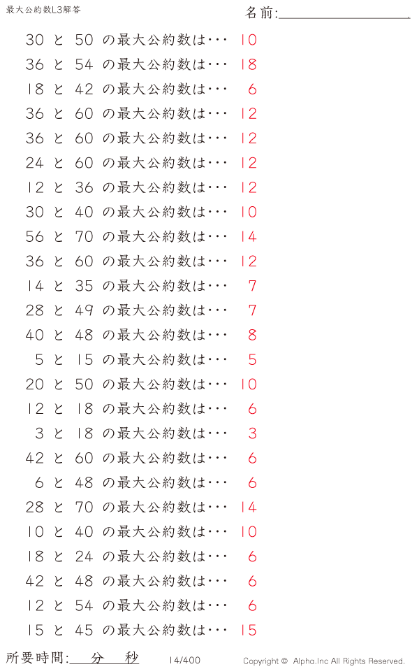 上記のボタンから「最大公約数レベル3」の算数数学ドリル・計算ドリル(PDFプリント)がダウンロードできます。個人利用は無料です(家庭以外での配布は有料です)。
