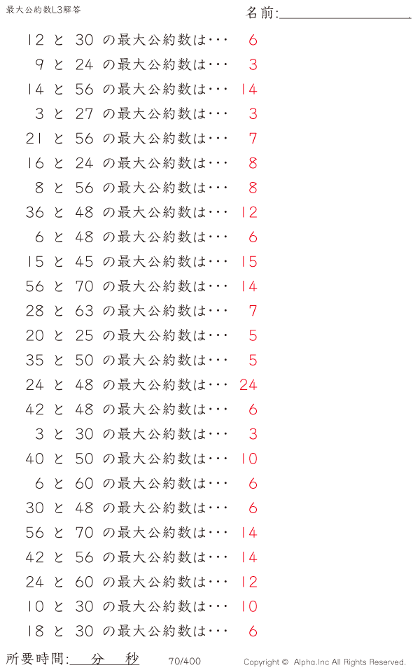 上記のボタンから「最大公約数レベル3」の算数数学ドリル・計算ドリル(PDFプリント)がダウンロードできます。個人利用は無料です(家庭以外での配布は有料です)。