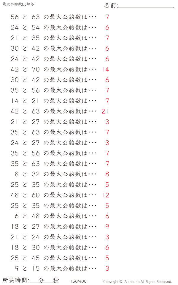 上記のボタンから「最大公約数レベル3」の算数数学ドリル・計算ドリル(PDFプリント)がダウンロードできます。個人利用は無料です(家庭以外での配布は有料です)。