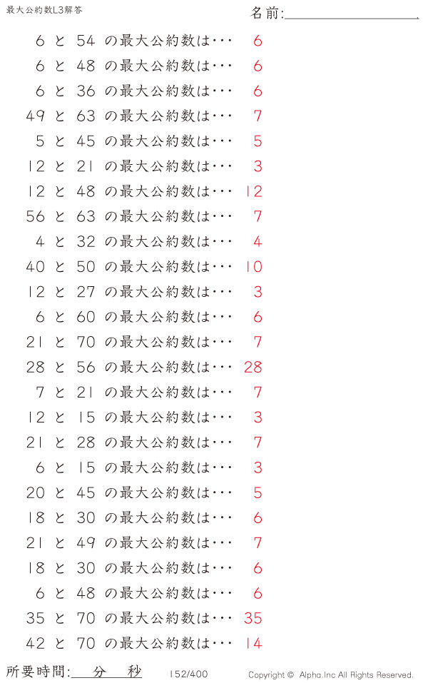 上記のボタンから「最大公約数レベル3」の算数数学ドリル・計算ドリル(PDFプリント)がダウンロードできます。個人利用は無料です(家庭以外での配布は有料です)。