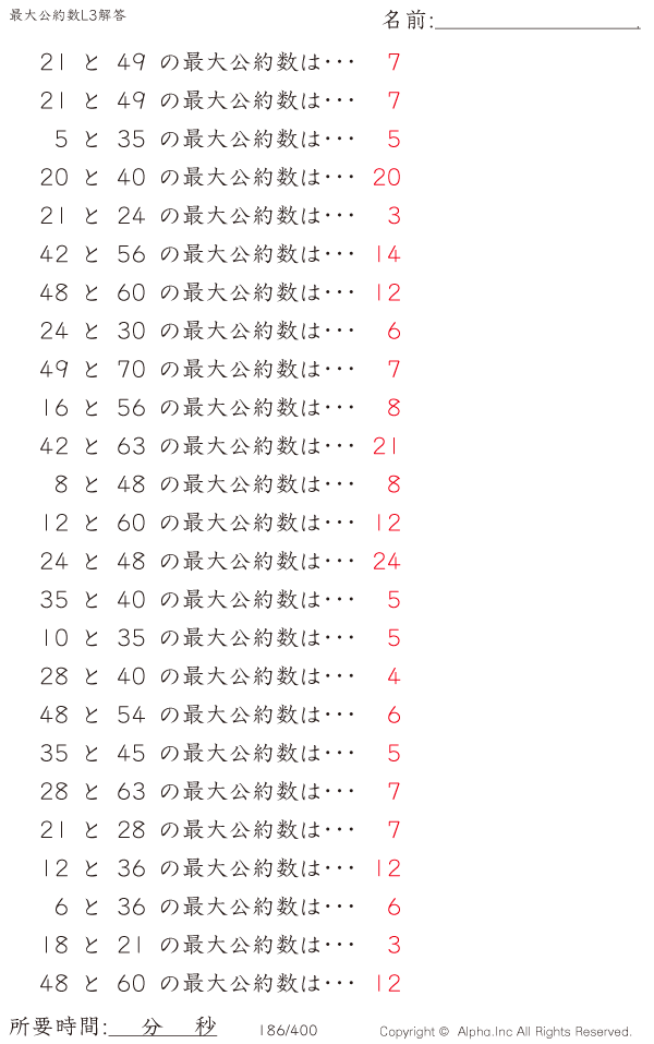 上記のボタンから「最大公約数レベル3」の算数数学ドリル・計算ドリル(PDFプリント)がダウンロードできます。個人利用は無料です(家庭以外での配布は有料です)。