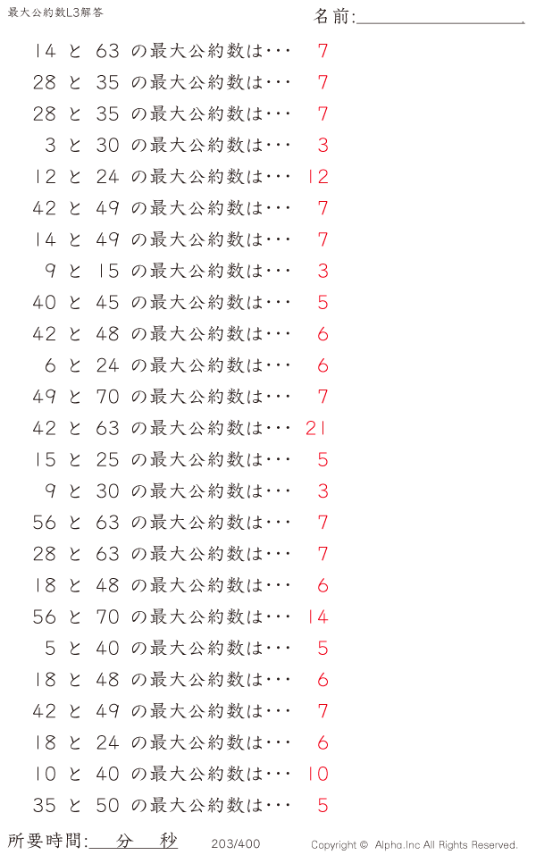 上記のボタンから「最大公約数レベル3」の算数数学ドリル・計算ドリル(PDFプリント)がダウンロードできます。個人利用は無料です(家庭以外での配布は有料です)。