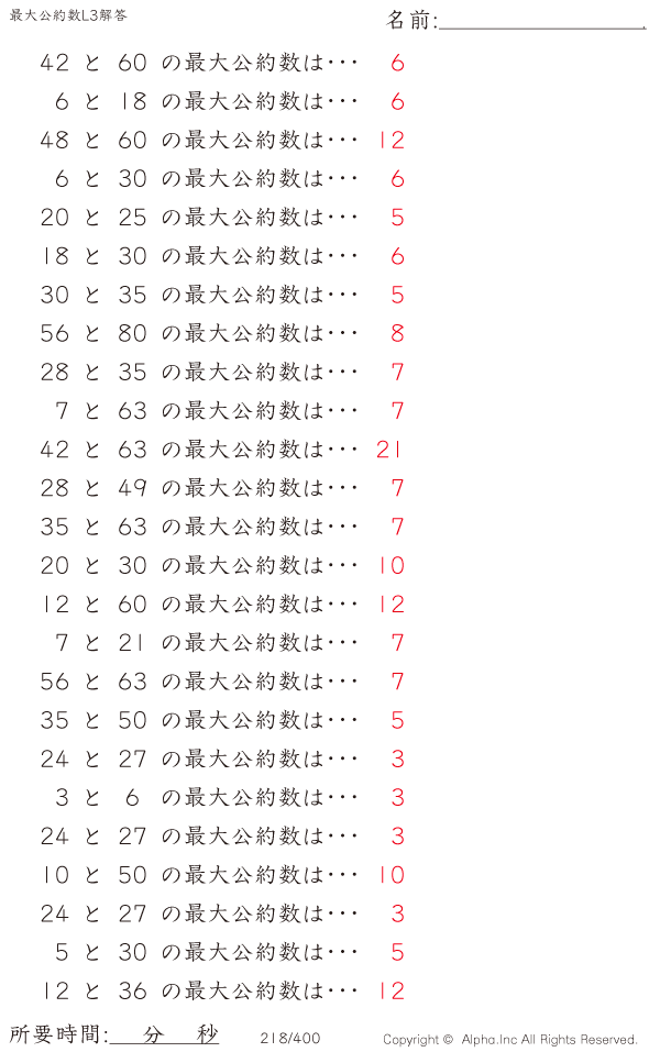 上記のボタンから「最大公約数レベル3」の算数数学ドリル・計算ドリル(PDFプリント)がダウンロードできます。個人利用は無料です(家庭以外での配布は有料です)。