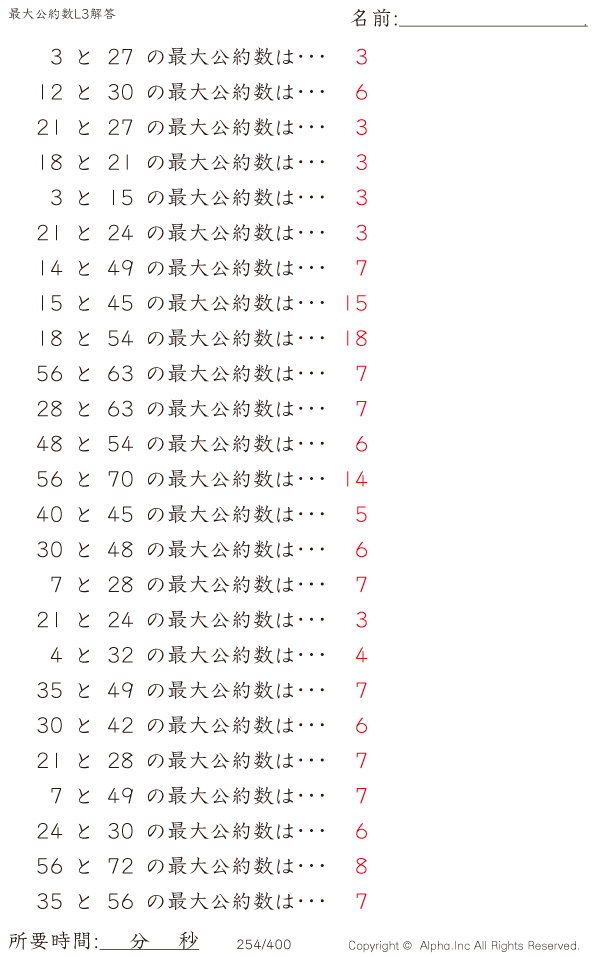 上記のボタンから「最大公約数レベル3」の算数数学ドリル・計算ドリル(PDFプリント)がダウンロードできます。個人利用は無料です(家庭以外での配布は有料です)。