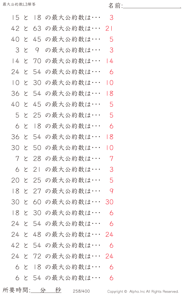 上記のボタンから「最大公約数レベル3」の算数数学ドリル・計算ドリル(PDFプリント)がダウンロードできます。個人利用は無料です(家庭以外での配布は有料です)。