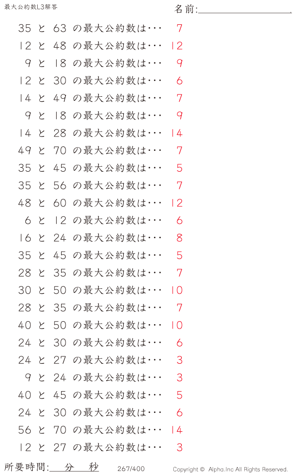 上記のボタンから「最大公約数レベル3」の算数数学ドリル・計算ドリル(PDFプリント)がダウンロードできます。個人利用は無料です(家庭以外での配布は有料です)。