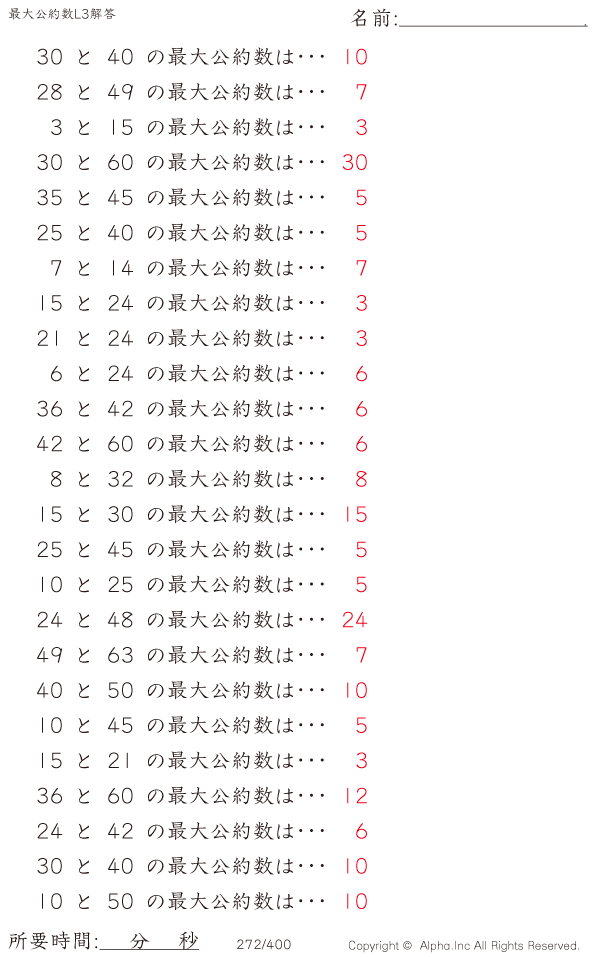 上記のボタンから「最大公約数レベル3」の算数数学ドリル・計算ドリル(PDFプリント)がダウンロードできます。個人利用は無料です(家庭以外での配布は有料です)。