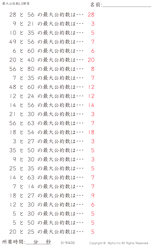 上記のボタンから「最大公約数レベル3」の算数数学ドリル・計算ドリル(PDFプリント)がダウンロードできます。個人利用は無料です(家庭以外での配布は有料です)。