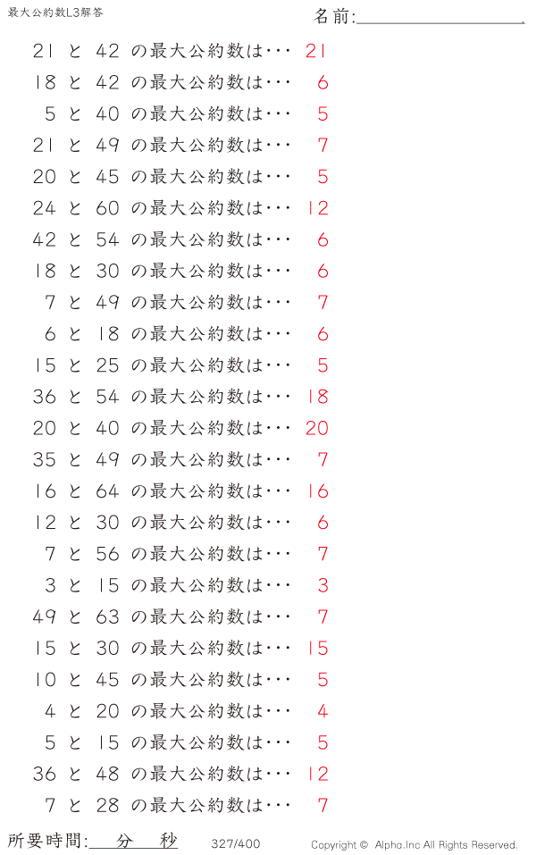 上記のボタンから「最大公約数レベル3」の算数数学ドリル・計算ドリル(PDFプリント)がダウンロードできます。個人利用は無料です(家庭以外での配布は有料です)。