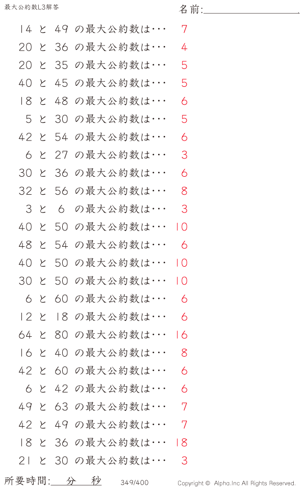 上記のボタンから「最大公約数レベル3」の算数数学ドリル・計算ドリル(PDFプリント)がダウンロードできます。個人利用は無料です(家庭以外での配布は有料です)。