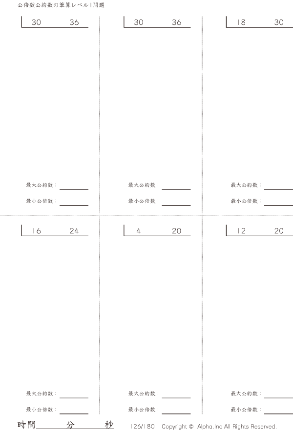 上記のボタンから「公倍数公約数の筆算-レベル1」の算数数学ドリル・計算ドリル(PDFプリント)がダウンロードできます。個人利用は無料です(家庭以外での配布は有料です)。