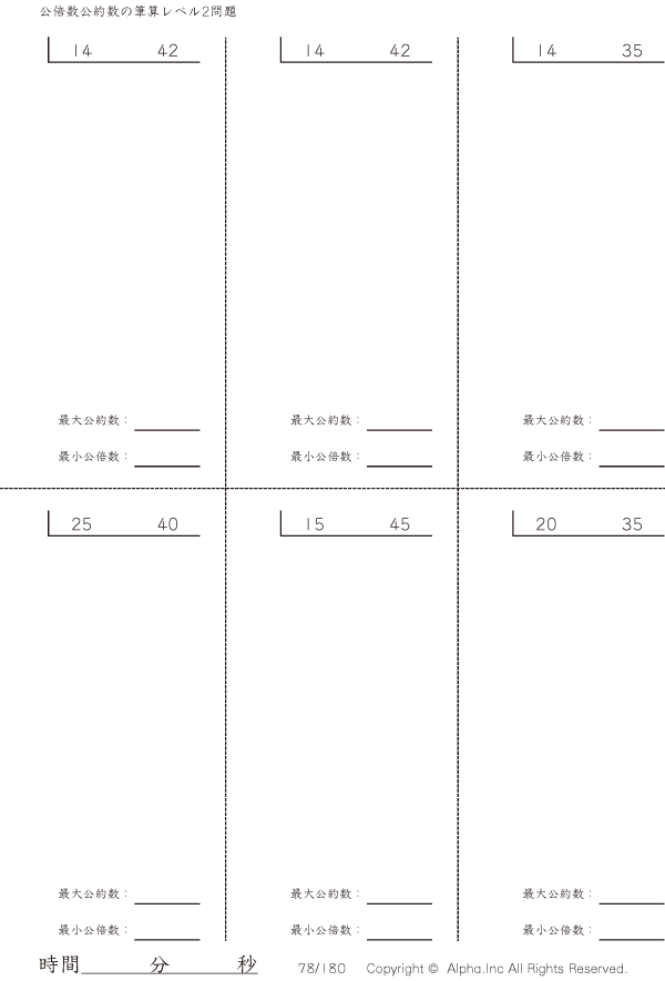 上記のボタンから「公倍数公約数の筆算-レベル2」の算数数学ドリル・計算ドリル(PDFプリント)がダウンロードできます。個人利用は無料です(家庭以外での配布は有料です)。