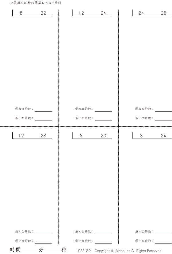 上記のボタンから「公倍数公約数の筆算-レベル2」の算数数学ドリル・計算ドリル(PDFプリント)がダウンロードできます。個人利用は無料です(家庭以外での配布は有料です)。