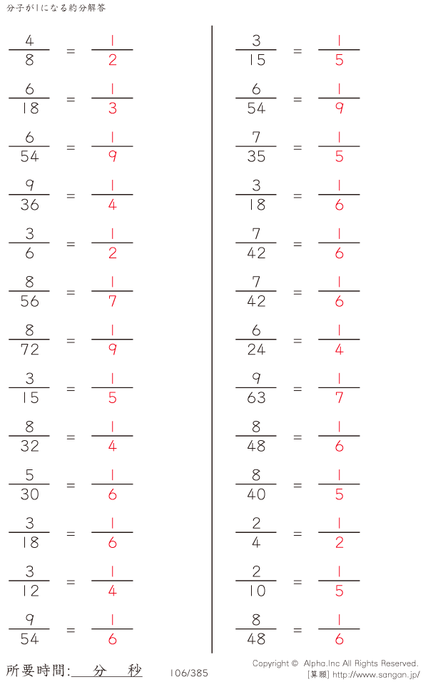 上記のボタンから「分子が1になる約分」の算数数学ドリル・計算ドリル(PDFプリント)がダウンロードできます。個人利用は無料です(家庭以外での配布は有料です)。