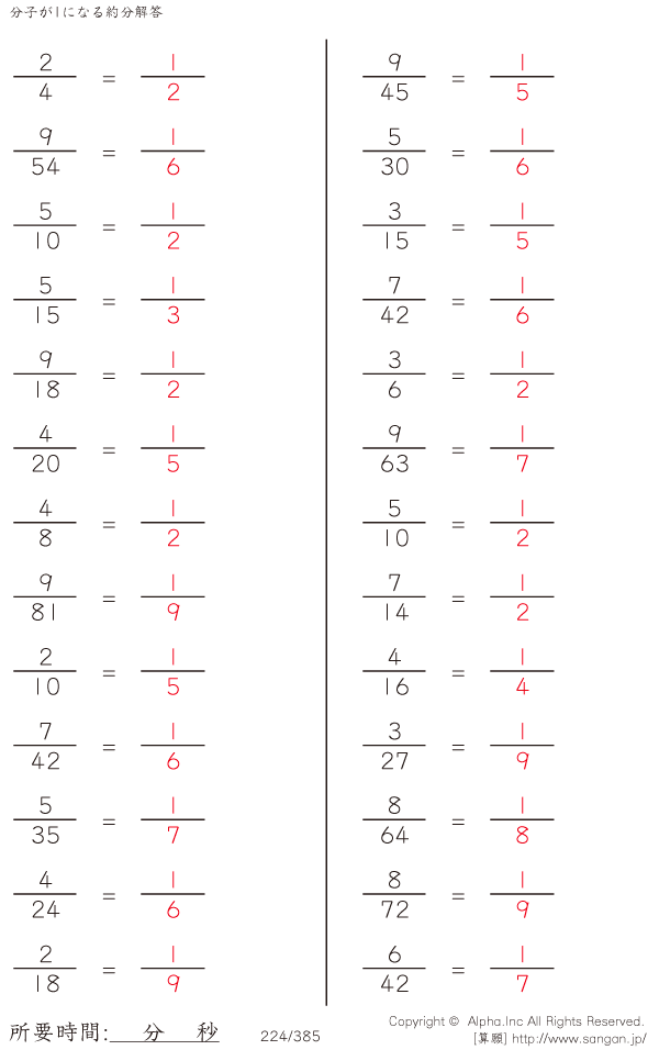 上記のボタンから「分子が1になる約分」の算数数学ドリル・計算ドリル(PDFプリント)がダウンロードできます。個人利用は無料です(家庭以外での配布は有料です)。