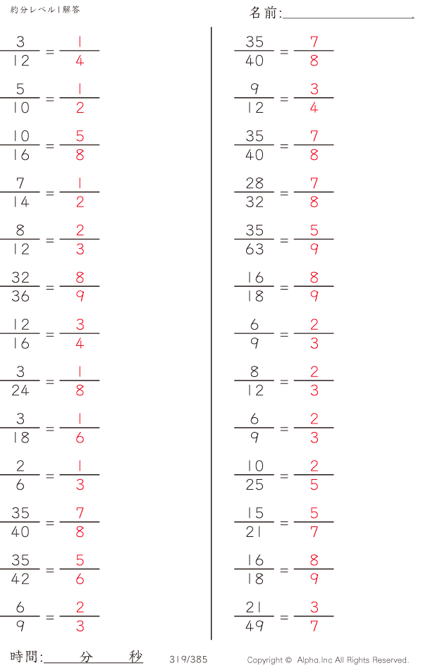 上記のボタンから「約分レベル1」の算数数学ドリル・計算ドリル(PDFプリント)がダウンロードできます。個人利用は無料です(家庭以外での配布は有料です)。