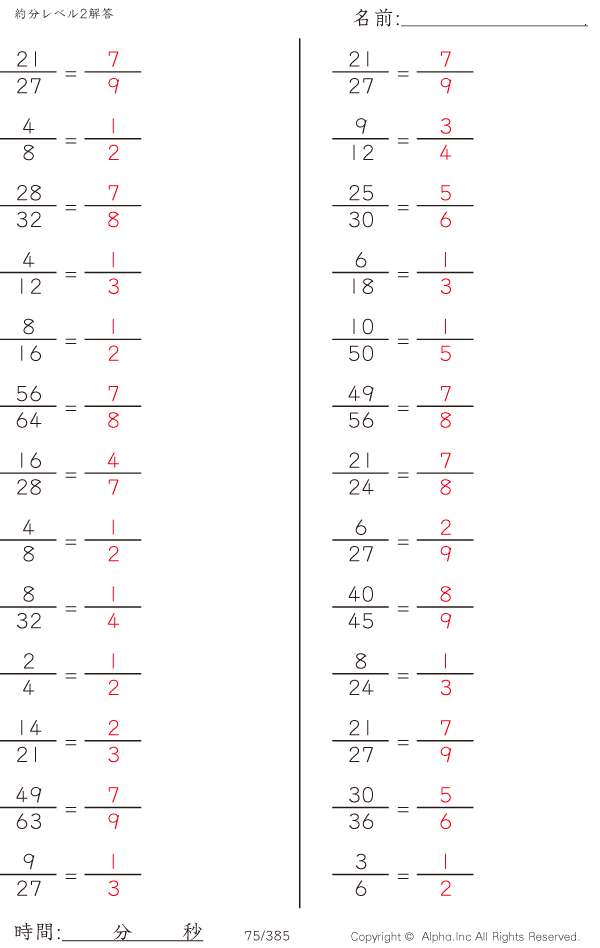 上記のボタンから「約分レベル2」の算数数学ドリル・計算ドリル(PDFプリント)がダウンロードできます。個人利用は無料です(家庭以外での配布は有料です)。
