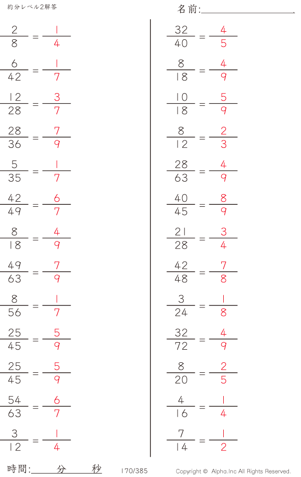 上記のボタンから「約分レベル2」の算数数学ドリル・計算ドリル(PDFプリント)がダウンロードできます。個人利用は無料です(家庭以外での配布は有料です)。