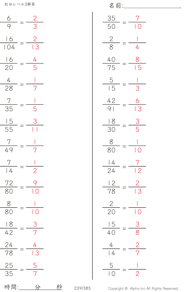 上記のボタンから「約分レベル3」の算数数学ドリル・計算ドリル(PDFプリント)がダウンロードできます。個人利用は無料です(家庭以外での配布は有料です)。