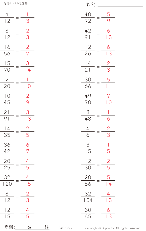 上記のボタンから「約分レベル3」の算数数学ドリル・計算ドリル(PDFプリント)がダウンロードできます。個人利用は無料です(家庭以外での配布は有料です)。