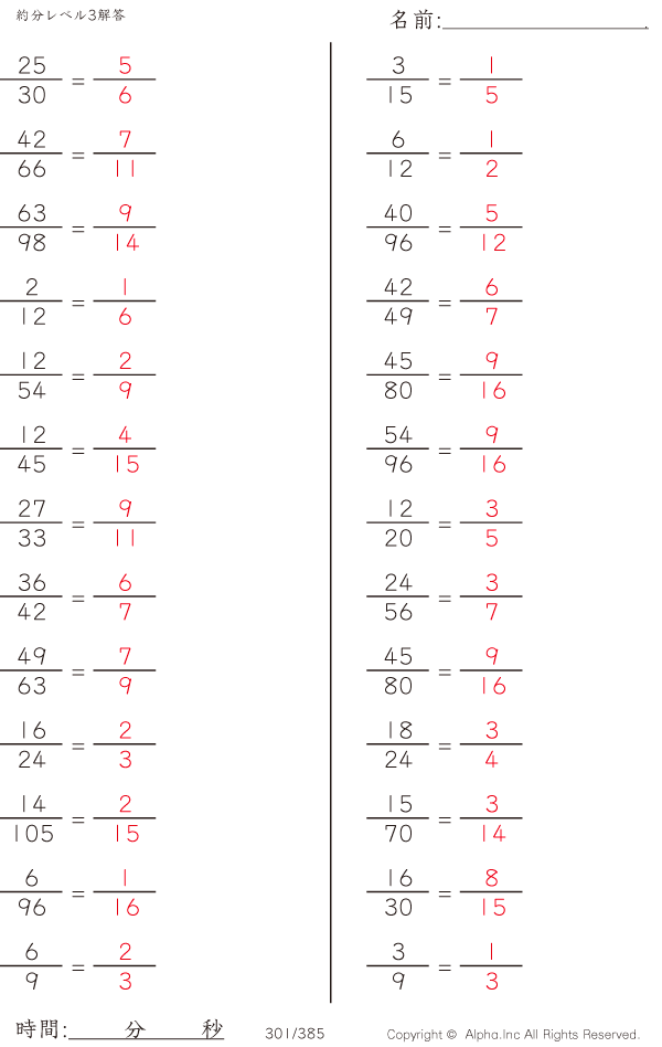 上記のボタンから「約分レベル3」の算数数学ドリル・計算ドリル(PDFプリント)がダウンロードできます。個人利用は無料です(家庭以外での配布は有料です)。