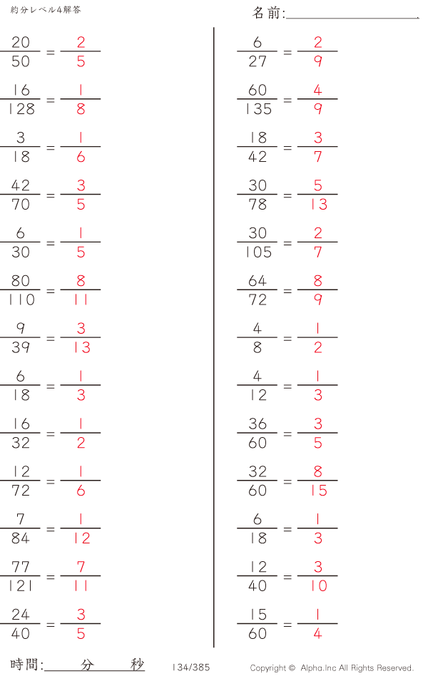 上記のボタンから「約分レベル4」の算数数学ドリル・計算ドリル(PDFプリント)がダウンロードできます。個人利用は無料です(家庭以外での配布は有料です)。
