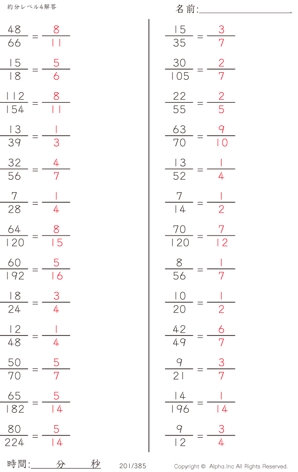 上記のボタンから「約分レベル4」の算数数学ドリル・計算ドリル(PDFプリント)がダウンロードできます。個人利用は無料です(家庭以外での配布は有料です)。