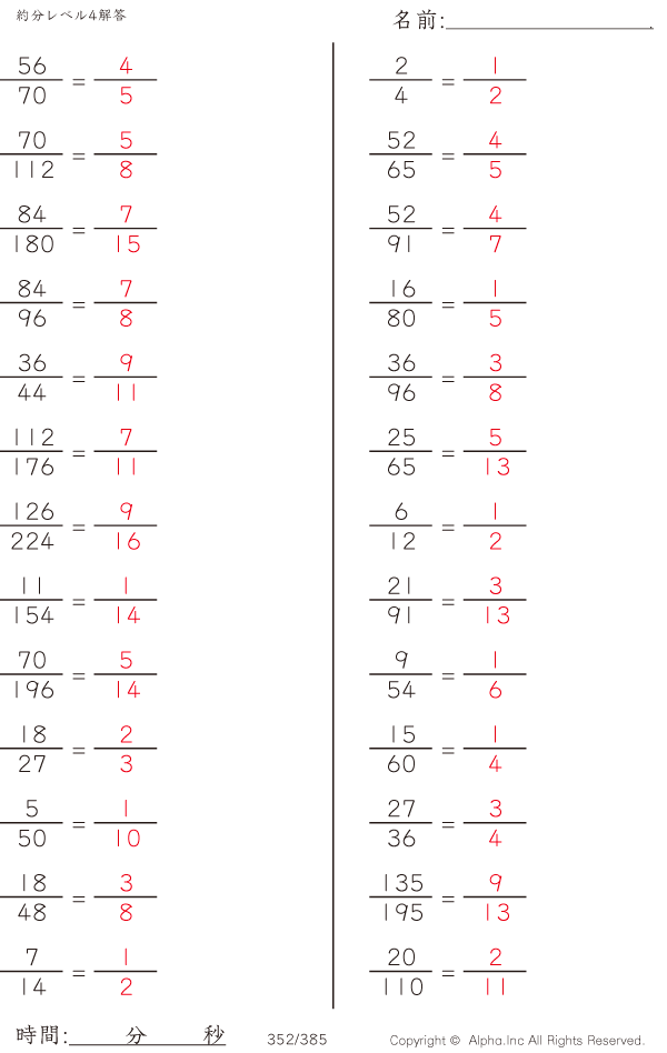 上記のボタンから「約分レベル4」の算数数学ドリル・計算ドリル(PDFプリント)がダウンロードできます。個人利用は無料です(家庭以外での配布は有料です)。