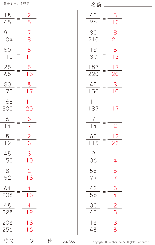 上記のボタンから「約分レベル5」の算数数学ドリル・計算ドリル(PDFプリント)がダウンロードできます。個人利用は無料です(家庭以外での配布は有料です)。