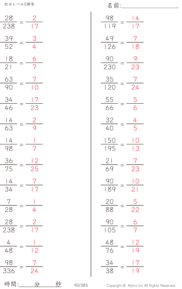 上記のボタンから「約分レベル5」の算数数学ドリル・計算ドリル(PDFプリント)がダウンロードできます。個人利用は無料です(家庭以外での配布は有料です)。